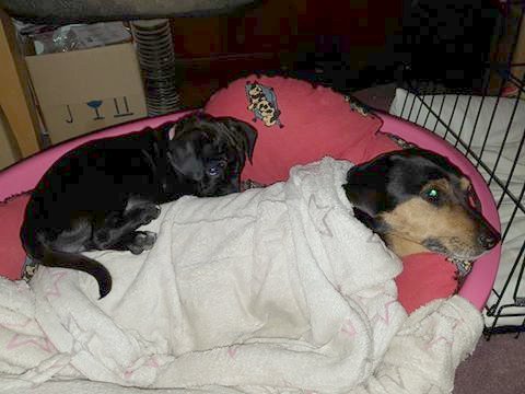I was rather pleased to find my dog on the bed this morning. He’s taken to playing chase with the puppy and it is rather obvious he is wearing himself out doing so. He certainly overdid it last weekend and when I came home yesterday evening he didn’t have the energy to get out of his basket. Apparently he came upstairs of his own volition last night and "er indoors TM" lifted him on to the bed.